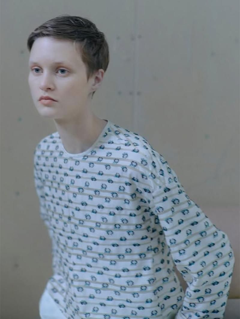 ボーダー柄にのせたフラワージャカード素材が印象的なプルオーバーブラウス。