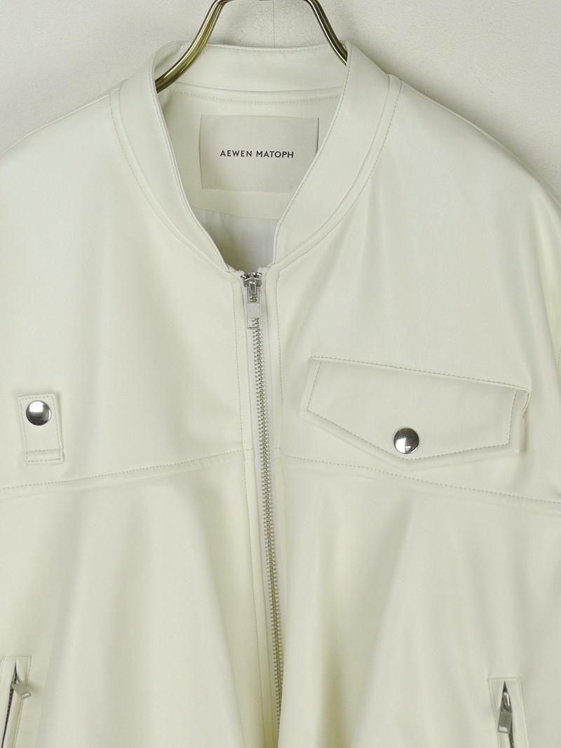 フライトジャケットのディテールに、ドット釦やファスナーのメタルパーツがアクセントのエコレザージャケット。