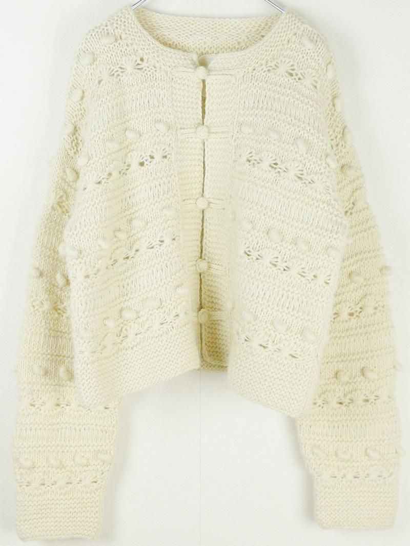 ポコポコとしたかわいい編地に、チャイナ風のニットボタンもアクセントになっています。