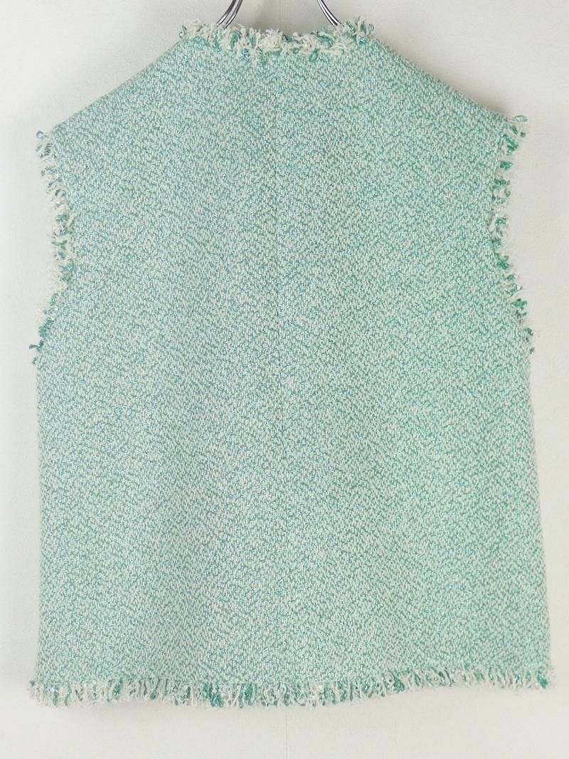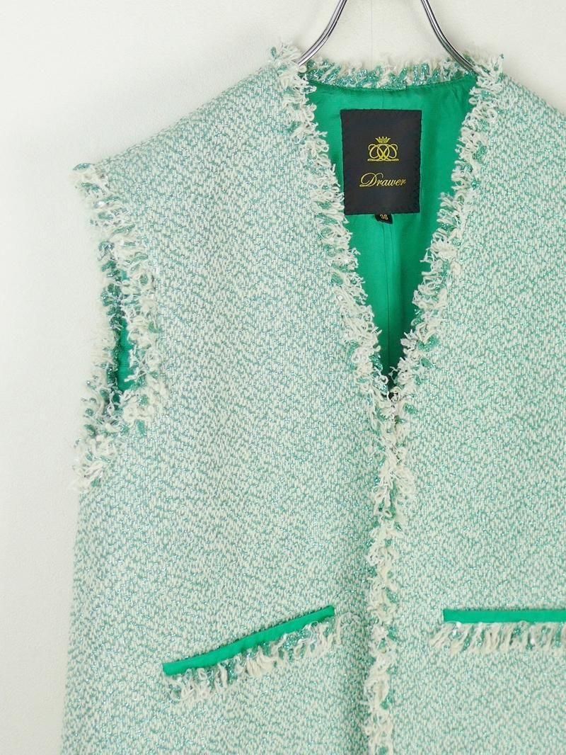 煌めくグリーンのツイード素材が映えるジレ/ベスト。