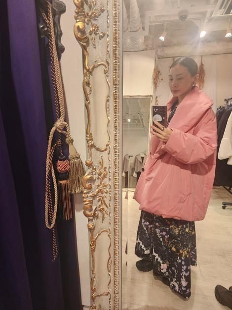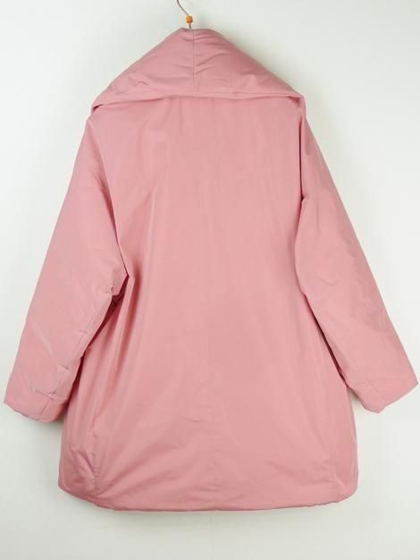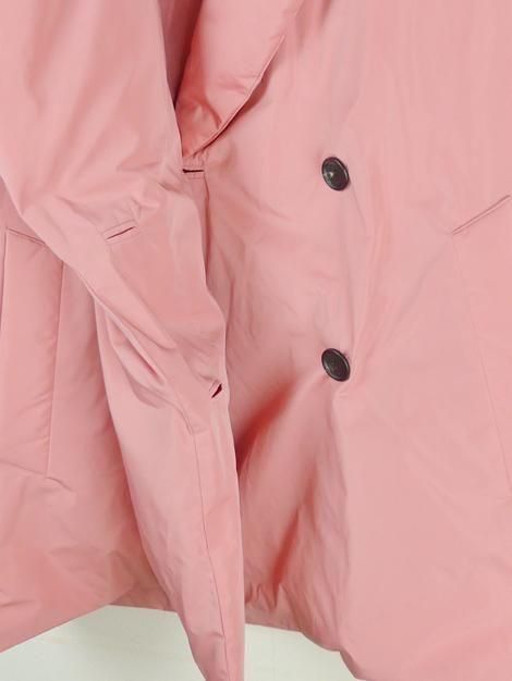 華やかなピンクカラーのミドル丈ダウンコート。経糸にポリエステル・緯糸にシルクを使用したタフタ素材は上品な光沢感があり、目を惹くショールカラーと包まれるようなフォルムが相まって女性らしさを引き立てます。